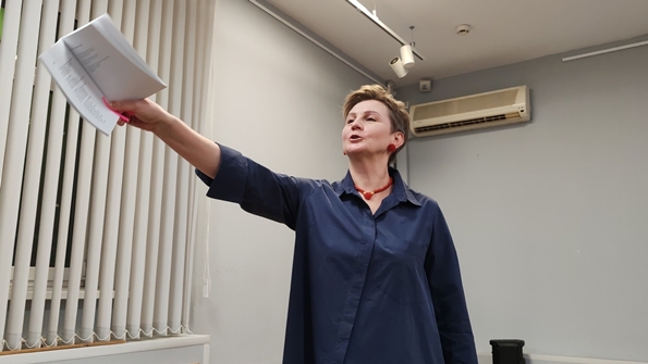 Погас свет, и на экране появились кадры с фотографиями мероприятия в «Чеховке» в 2012 году («ещё в старых стенах до ремонта»), когда презентовалась книга «Домохозяйкин блюз»: «вспомним молодость» (книга в своё время попала в финал литературной премии «Московский счёт»). Шевченко то с шутками-прибаутками, то с иронией попутно комментировала экран: