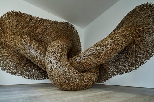 Извивающаяся масса неистовой энергии от пола до потолка в инсталляции Танабэ Чикуунсая IV «Врата», соткана из тигрового бамбука, вращается воронкообразным облаком, усиками огромной виноградной лозы, кровеносной системой гиганта. Неземная и подавляющая, невесомая и сокрушительная. Необыкновенная.