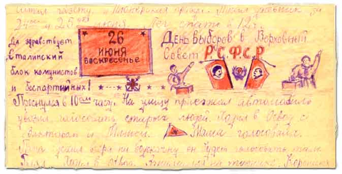 Проснулся в 10-ом часу. На улицу приезжал автомобиль увозил голосовать старых людей. Ходил в ОСВод с Виктором и Мишей. Мама голосовала. Папа уехал вчера на водокачку он будет голосовать там. Гулял. Ходил в ОСВод. Занимался на турнике. Хоронился в саду в лопухах, а Сергей нас ловил. Лопухи очень высокие встаю во весь рост, а не видно. Гулял. Хоронились в лопухах. Обедал. Гулял. Пил чай. Читал журнал. Лег спать в 11-ом часу. Выпустили почтовые марки с гербами союзных республик. Каждая стоит 20 к. в Москве их уже продают.
