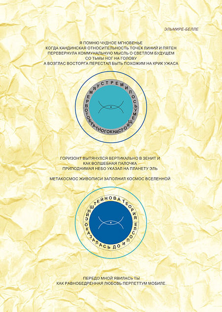 Это комплекс словесно-цветовых композиций, в основе которого опять-таки лежит протосмысл, глубинный фундамент материи и духа. Вглубь визуальных пространств помещены стихотворные строки: «Было время // не было воздуха // теперь его много / но // НЕТ // времени». Стихи подчиняются визуальному порядку Трансрадуги, они располагаются внутри той или иной фигуры, в соответствии с ее исконной формой, не ломая ее пределов. Геометрическая форма лежит в основе языка; для ее познания нужно вчитаться в поэтическую речь. Иначе не отыскать ключа к этой двери.