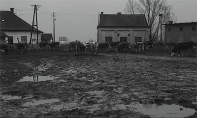 Первая сцена – начало фильма Бела Тарра «Сатантанго» (Sátántangó, 1994), план-эпизод длительностью 7 минут 30 секунд, который представляет собой съёмку идущих по венгерской деревне коров и быков.