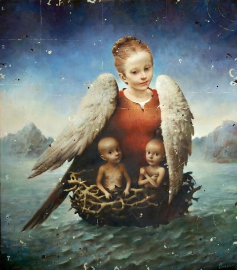 Но живопись мастера не сказочная, нет. Она сверхреалистична, если понимать под реальностью не внешнее существование, но подлинное, глубинное, вневременное. А пробиться к такой подлинности можно только под знаком утраты. Между реальностью детства и действительностью взрослости существует некая точка невозврата. Все эти детские лики на полотнах Римашевского находятся на грани всеобъемлющего счастья и надвигающейся твёрдой почвы – логики, прагматизма, одиночества – которая приземляет, приковывает, лишает крыльев. Для ангелов не существует времени. Там, где появляется время, ангелы исчезают. У Римашевского они среди нас. Они ещё не утратили единства с миром, не прибиты к земле. Это и есть дети. До пробуждения жестокости и практичности. Дети, которые защищают нас от самих себя, от чудовищ нашего подсознания, от эгоизма и разделённости, от тотального одиночества и покинутости. В этих детях нет безмятежности и счастья. Они принимают на себя нашу тоску по утраченному совершенству. Воспроизводят в нас ощущение скорого изгнания из рая, огрубления, появления времени, старения, убывания… Как раскалённый кусок металла, зажатый щипцами в ожидании первого удара молота, который придаст завершённую форму, превратит в острый предмет.