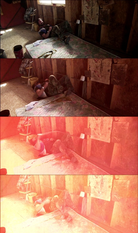 Открытие этого обстоятельства – травма. Майк и Крис понимают, что они – персонажи, действующие в истории, которую создаёт Нечто. Сцена разоблачения ошеломляющая, пусть Бенсон и Мурхед исподволь и подготавливают к ней зрителя. Сначала красные пятна, которые часто появляются на плёнке из-за паразитных засветок, представляются принадлежащими именно плёнке. Затем на отметке 00:49:30 внедиегетический голос произносит ключевую фразу «Это просто история», и экран вспыхивает красной паразитной засветкой. Красная засветка – это знак, сбой монтажа кадров, разоблачающий присутствие Нечто.