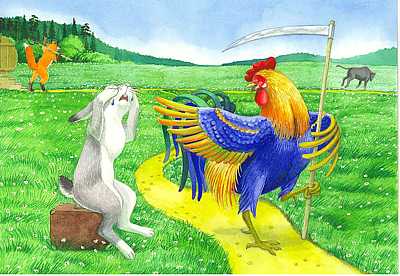 И Медведь в страхе убежал. То же затем происходит с Собакой. Наконец, встречается Зайке Петух с косой. Тот, проведав о Зайкиной беде, встал напротив избушки и приговаривает: