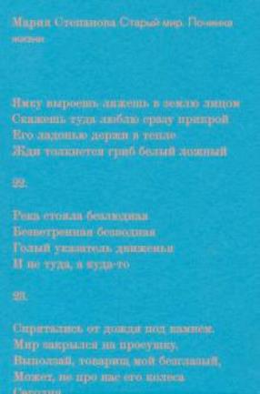 Однако Степанова использует здесь негации для того, чтобы разрывать смысловые звенья и на мгновение открывать никем не тронутый и самодостаточный вакуум поэзии, то есть буквально поэтическое поле пробела, который не только без смысла, но и без бессмыслицы: