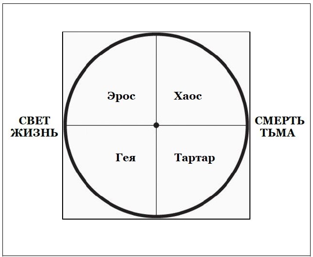 В древнегреческой мифологии, изложенной Гесиодом (VIII-VII вв. до н.э.) в его «Теогонии»[iv], утверждалось, что изначально Космос есть единство одновременно четырех состояний: с одной стороны, утверждающие жизнь Гея и Эрос; с другой – противоположные им и даже отрицающие их Хаос и Тартар.