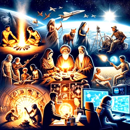 Для этого ему требуются определенные знания. И он начинает их добывать всеми способами, например, увидев, как камни быстро катятся с горок, он придумывает колесо, поняв, что огонь и светит, и греет, человек придумывает светильники и печи, в которых он, к тому же, начинает варить пищу, становясь уже не звероподобным, а деловитым и более сообразительным в отношении изобретения того и сего.