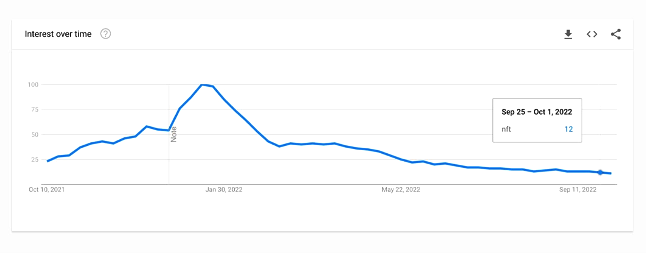 Исходный график: Снижение объёма торговли NFT и поисковых запросов (2022г.)
