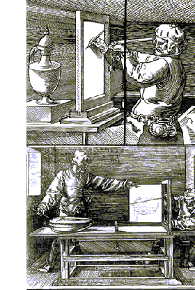 Перспектива была открыта трудами инженеров-художников по разысканию первой истины вещей, явленной нам в зримом. Художники сами разработали ее математическую форму и инженерную реализацию в простейших приборах вроде конструкций Альберти или Дюрера, составленных из рамок, крючков, узлов и шнурков. Они-то и начали ту материализацию света, что у Ньютона завершилась представлением светового луча твердым четырехгранным стержнем.