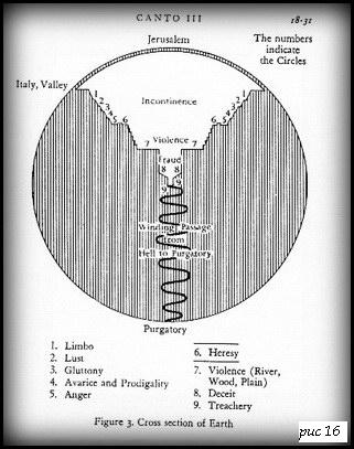 Подробнее о сделанных В.Топоровымвыводах мы надеемся поговорить в дальнейшем, пока же еще больше хочется акцентировать отмеченные им топологические свойства пути. Допустим, первый план (путешествия, произведения) задается топологически, как - сакральный (или смысловой) его центр, начало и конец пути (а также его кульминационная точка). Но центр - иначе, чем конец, представляет цель всего пути, - с самого начала разница неизвестного центра и известногоконца пути обнаруживается в самом пути. При том, что путь по завершении, именно в конце откроет этот центркак смысл всего пути (и произведения, даже если топографически центр был пройден как его часть), конструируя символ путь → смысл пути. В первом и топологически ориентирующем плане, имеющем начало, предстоящий путь и предполагаемый конец, - проступает символическое пространство, происходит открытие центра, как раскрытие смысла, путь претворяется уровнями освоения (сакрального) центра в символическую картину мира. Центр никогда не задает всецелой символической глубины, само наличие пути а поэтому и его цели,заслоняют таинственно скрытый центр, или специально скрывают его, но центр непременно обнаружится и раскроет весь замысел. Последний никогда не случаен, случаен план пути, когда замысел на время покидает идущего. Конечно, топология мифо-поэтического сакрального пространства могла бы помочь систематически взглянуть на отдельные фрагменты космологии Данте, как и художественного мира «Комедии» в целом. Данте, своей поэмой скомпоновал в «один космический дом» классический греко-римский миф и христианско-схоластический, Топоров наоборот «распотрошил» мифопоэтическое сознание, вычленив из него пространственную архетипику. В дальнейшем описании, из космологии «Комедии» мы не стремимся экстрагировать концептуальные структуры В.Топорова, но учитываем их, и прослеживаем развертывание горизонтальных и вертикальных сакральных пространств там, где они выражены достаточно явно, кроме того, отмечаем сакральные границы и центры, задающие космологическую направляющую Данте и Вергилию.