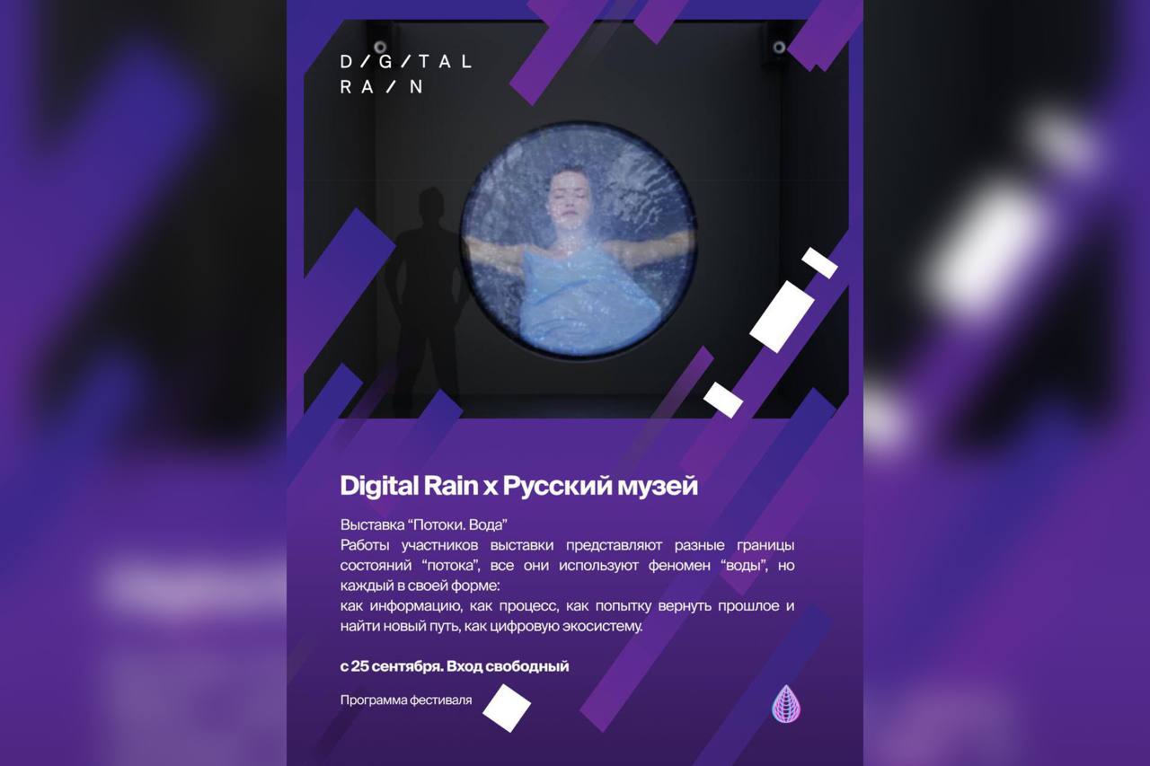 Выставка «Потоки. Вода», открывшаяся в Русском музее в рамках фестиваля медиаискусства Digital Rain, продолжает свою работу. Экспозиция в Западном павильоне Михайловского замка, открывшаяся в рамках фестиваля медиаискусства Digital Rain, объединяет произведения медиаарта и новых медиа, созданные российскими и зарубежными авторами. Каждая представленная работа рассказывает о воде и явлении «потока». Жидкость проявляется интенсивно, в большей степени не как эффект противопоставления и контраста, а как эффект распространения.