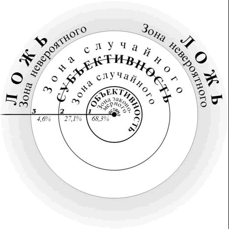 Во «Введении» логика была определена нами как связь между понятиями. Попытаемся ее проследить на рис.1. На нем, за пределами площади рассеивания выделена зона отсутствия случайных событий – «зона невероятного», зона «абсолютной лжи». В следующем кольце, включающем 4,6% событий, появляется возможность обмана – «возможное» мы можем принять за реальность. В очередном кольце реальность не превышает 27,1%, а вероятность ошибки оказывается вдвое больше реальности (реальная вероятность около 1/3, вероятность отсутствия событий, т.е. «ошибки», – около 2/3). Наконец в центральном малом круге преобладает реальность, то есть «объективность». Исходя из особенностей распределения событий по площади круга рассеивания, можно выделить разные варианты «связей» между понятиями, разный характер «логики». Отсутствие реальной связи понятий определим как «ложь». Случайную связь – как «субъективность», закономерную связь – как «объективность».